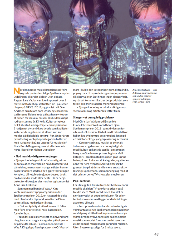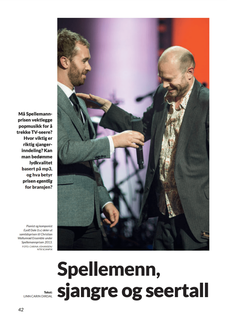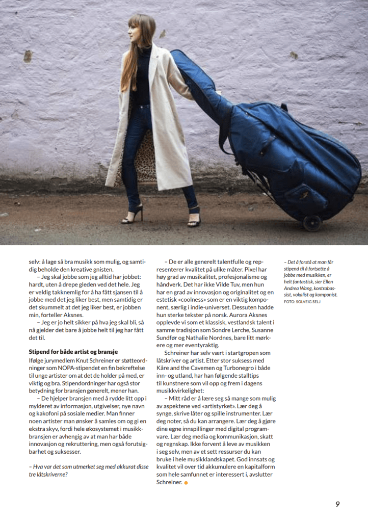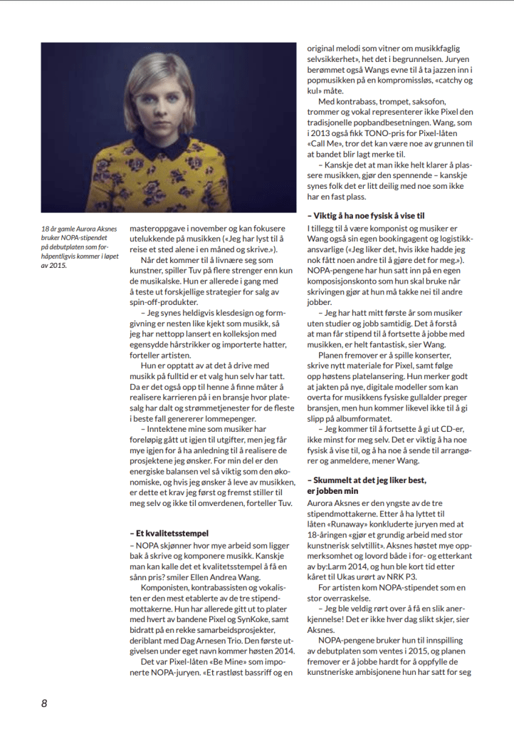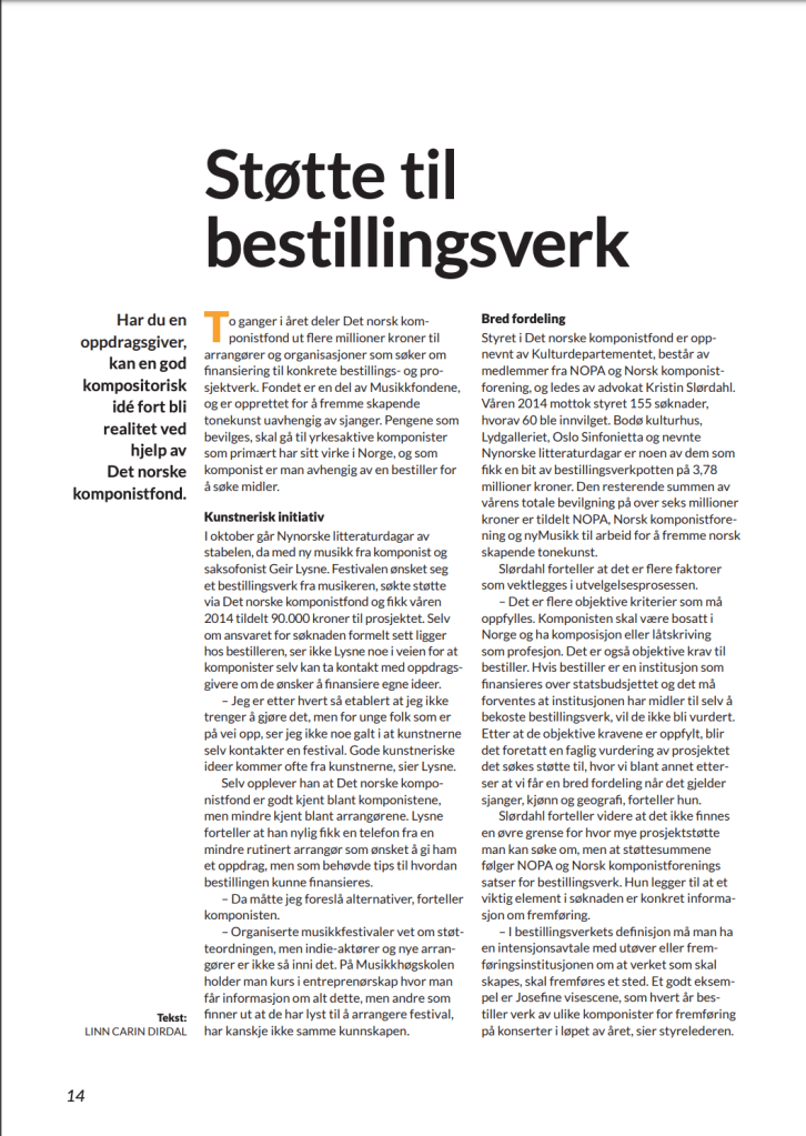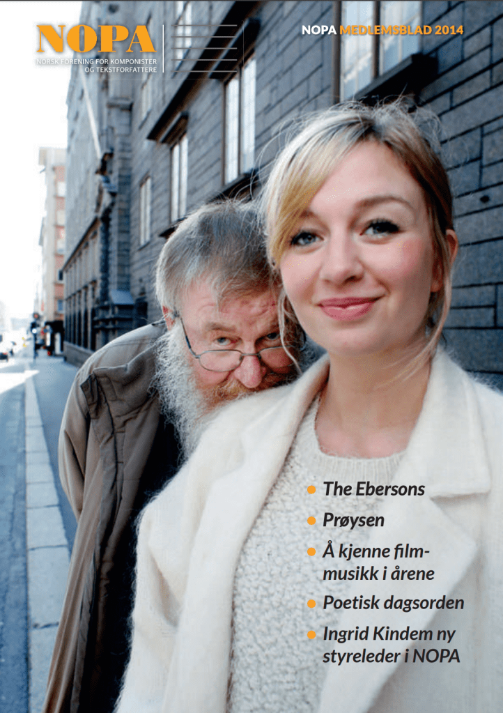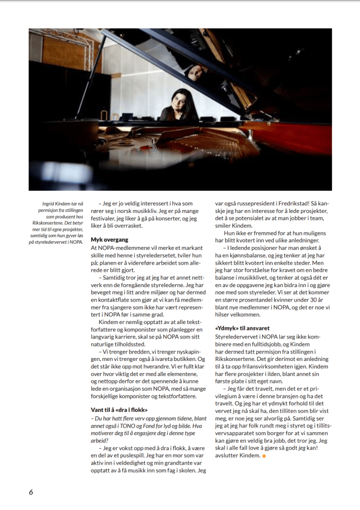 Bidragsyter til medlemsmagasinet for Norsk forening for komponister og tekstforfattere (NOPA) høsten 2014, med saker om ny styreleder Ingrid Kindem, NOPA-stipendet, støtte til bestillingsverk og Spellemann-prisens betydning for musikkbransjen.